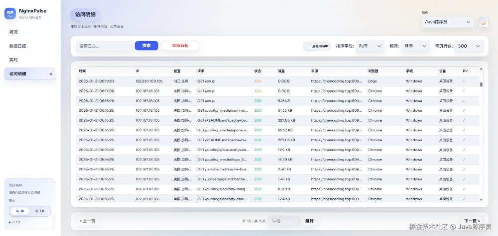 今天,给大家推荐一款开源的轻量级 Nginx 日志分析可视化面板,告别逐行翻日志! 项目介绍