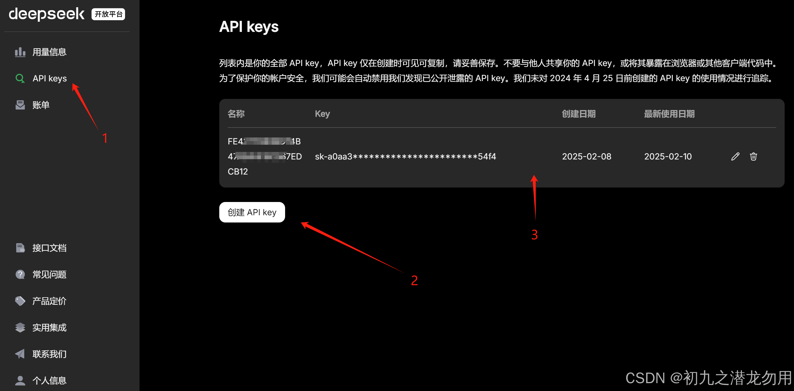 访问左侧 API keys 功能菜单,点击 “创建 API key” 按钮,按提示输入名称等点击确认即可生成 key 值,请务必妥善存储,这是调用 API 的关键认证信息值。