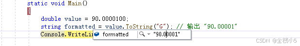 ToString("G") | 自动去除无效零 | 90.0000100 → "90.00001" |