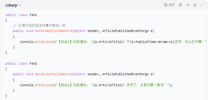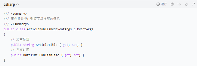 2.外部无法直接调用事件:只能由发布者自己在内部触发(比如示例中的OnArticlePublished方法),保证触发逻辑的可控性;