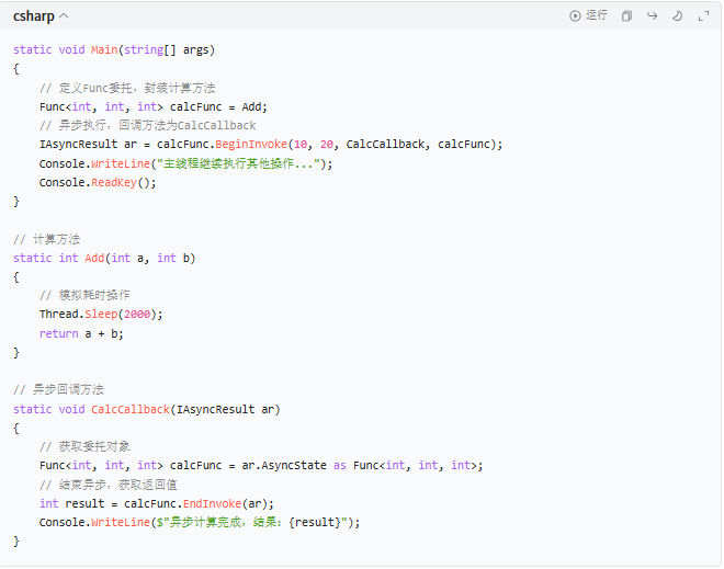 C#早期的异步编程(.NET Framework)大量使用委托的BeginInvoke/EndInvoke实现异步回调,比如异步执行一个计算方法,计算完成后通过委托回调通知主线程: