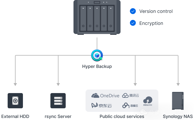 需特别注意:文件夹内挂载的其他设备文件夹无法备份,例如在 File Station 中挂载的 SMB 共享文件夹、NFS 文件夹,这类数据需通过对应设备的备份工具单独处理。 备份目的地:多场景覆盖,按需选择更高效 Hyper Backup 提供了丰富的备份目的地选项,不同备份内容对应的目的地有所差异,结合自身场景选择即可,同时提醒一个关键注意点。 ✦文件夹与套件备份目的地 选择范围最广,可适配个人、家庭及中小企业场景: • 跨设备备份:另一台群晖设备(适合异地备份、设备冗余); • 本地备份:群晖本地共享文件夹、外接 USB 设备(U盘、移动硬盘,适合快速备份、离线归档); • 公有云备份:京东云、S3 兼容存储设备等主流公有云服务; • 文件服务器备份:支持 rsync、WebDAV、OpenStack Swift 协议的文件服务器,适配企业现有存储架构。 ✦完整系统备份目的地 针对国内用户,目前仅支持备份至另一台群晖设备,建议用于企业双机冗余、重要系统异地备份场景。 ✦LUN 备份目的地 支持两类目的地:另一台群晖设备(跨设备冗余)、群晖内部共享文件夹或 USB 设备(本地归档、快速恢复)。
