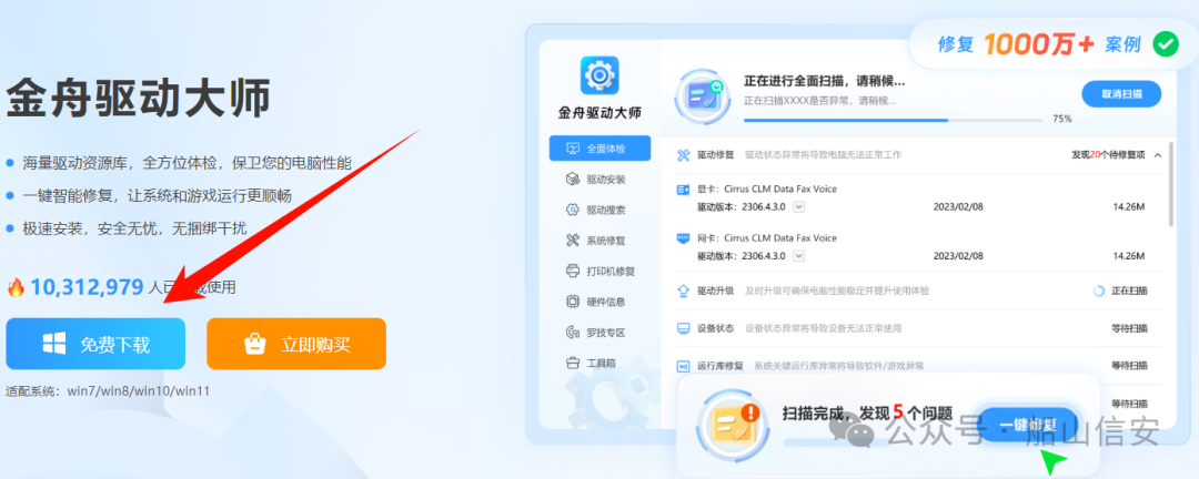 ✅适用人群:技术基础较好的用户,或前3种方案均无效的情况。⚠️注意事项:此操作会重置所有网络适配器设置,重启后可能需要重新输入WiFi密码。⭐核心优势:新版驱动通常包含算法优化,可以提高数据传输效率,从而提升网络吞吐量。这意味着更快的下载/上传速度、更低的延迟,对于在线游戏、高清视频流和大型文件传输尤为明显。1.访问金舟驱动大师下载页面:https://www.callmysoft.com/driver,下载安装最新版软件。