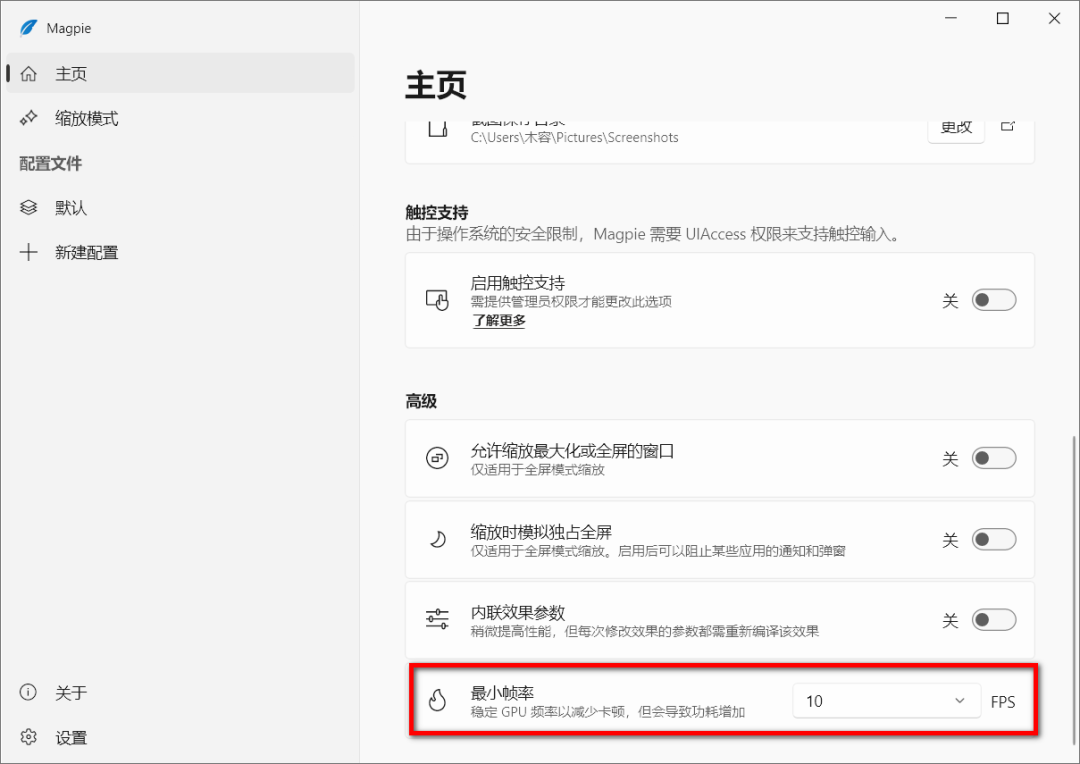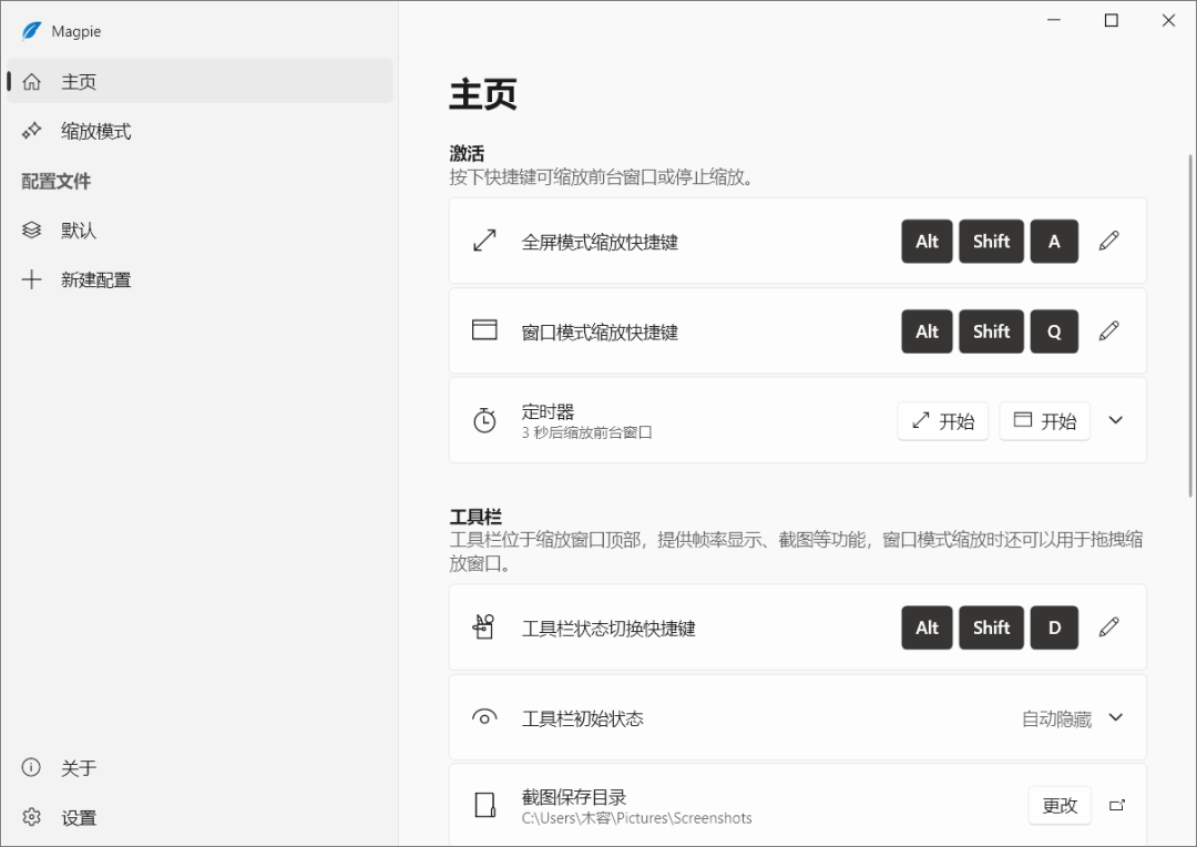 Magpie:一款轻量型窗口缩放工具,支持Win10和Win11使用,完全免费,便捷免安装,内置 Lanczos、FSR、CuNNy和Anime4K等7种算法。 ![]() ![]() 支持快捷键操作,窗口模式缩放快捷键Alt+Shift+Q,全屏模式缩放快捷键Alt+Shift+A。 ![]() ![]() 支持固定工具栏、截图和拖动对顶角缩放,支持调整帧率,最高支持60帧。 ![]()