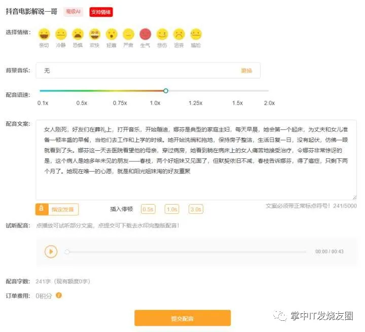 而且有些声音也不用添加情绪,它本身的连贯、停顿与起伏,与真人已经没什么差别了。 比如抖音一哥声音,用于影视解说,抖音上很多影视解说大V都在用: