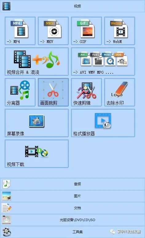 4、视频格式转换 格式工厂有时候我们从网上下载的视频格式,在剪辑软件中根本打不开,比如爱奇艺、优酷视频格式。此时,就可以使用格式工厂,转换为常用的视频格式。 除了视频格式转换,格式工厂还支持视频转码、去除水印、以及音频、图片、文档等格式的转换: