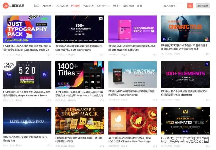 7、视频模板免费下载 lookae地址:https://www.lookae.com/ lookae上提供了大量的视频模板,包含有PR模板、AE模板、各类插件、视频素材等资源。 以PR模板为例,它提供的模板有:图形动画、三维动画、图表动画、文字标题动画、转场动画、遮罩动画.....等,大多数剪视频会遇到的动画动效,在这里基本都能找到。