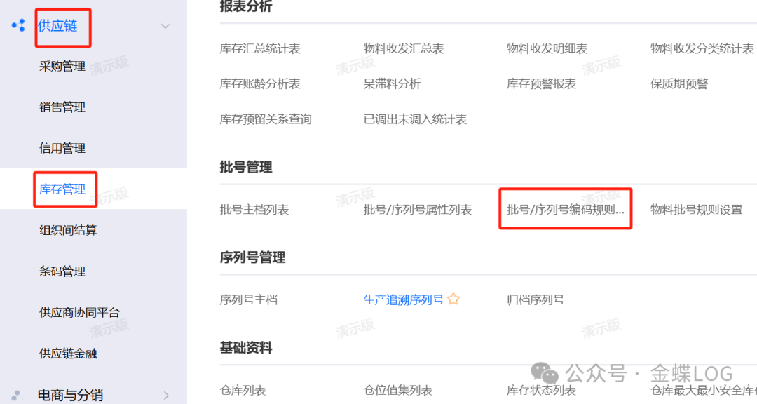 操作路径:【供应链】-【库存管理】-【批号/序列号编码规则】