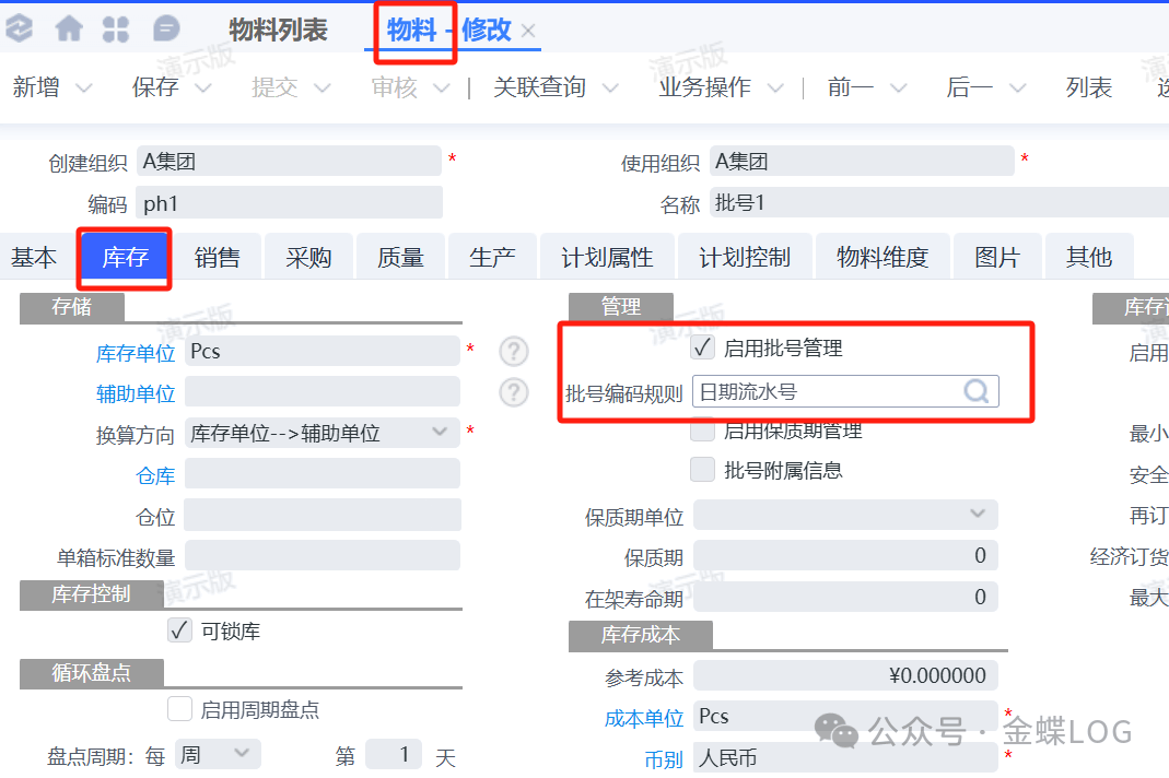 操作方式:打开对应的物料,进入【库存】页签,勾选 【启用批号管理】,并在 【批号编码规则】 字段中选择上一步创建好的编码规则。