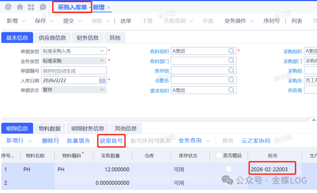 当启用了批号的物料入库时,系统会强制管控物料必须要录入一个具体的批号。