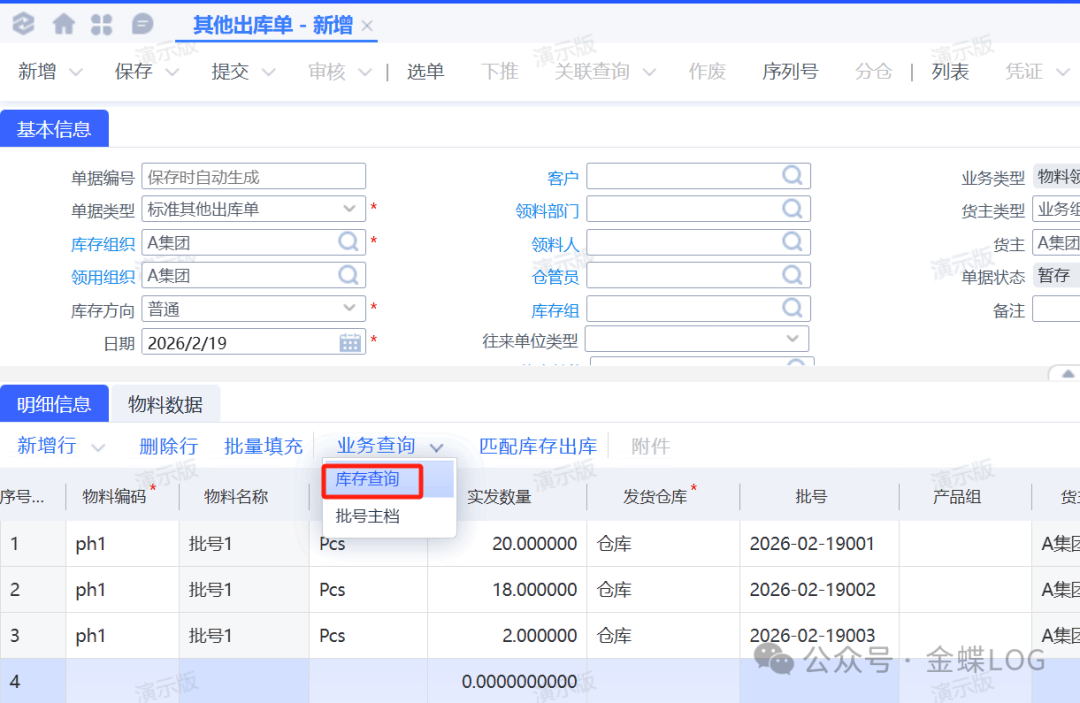 ①【业务查询】→【库存查询】:手动查看各批号库存,选择要出库的批号进行返回;