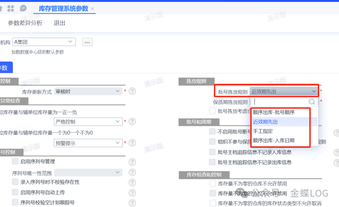 在【库存管理系统参数】中,可以进行【批号拣货规则】的设置,里面一共有四种选项:【顺序出库-批号顺序】、【近效期先出】、【手工指定】、【顺序出库-入库日期】