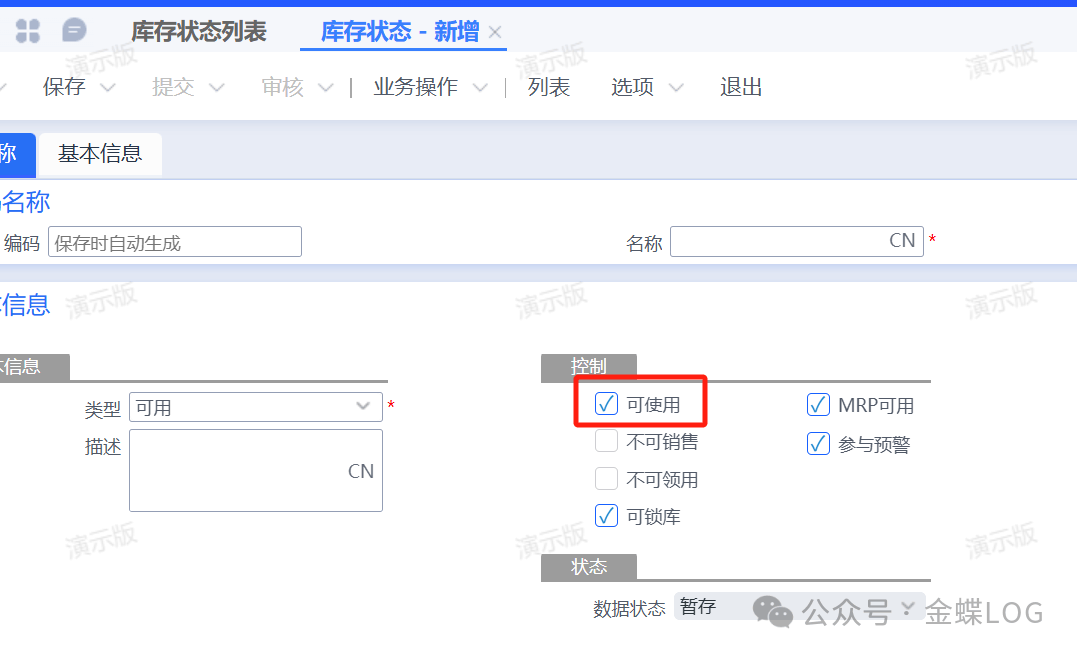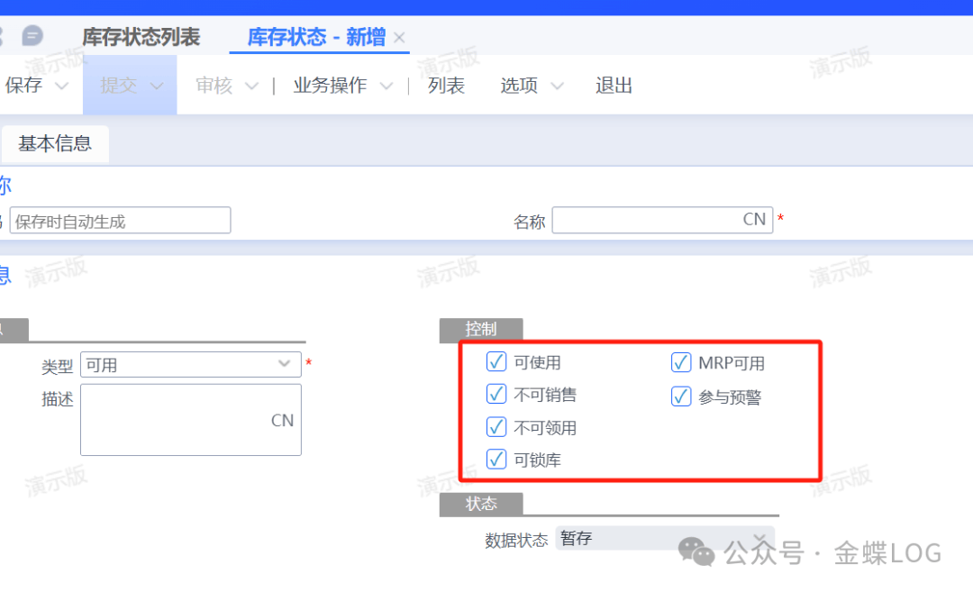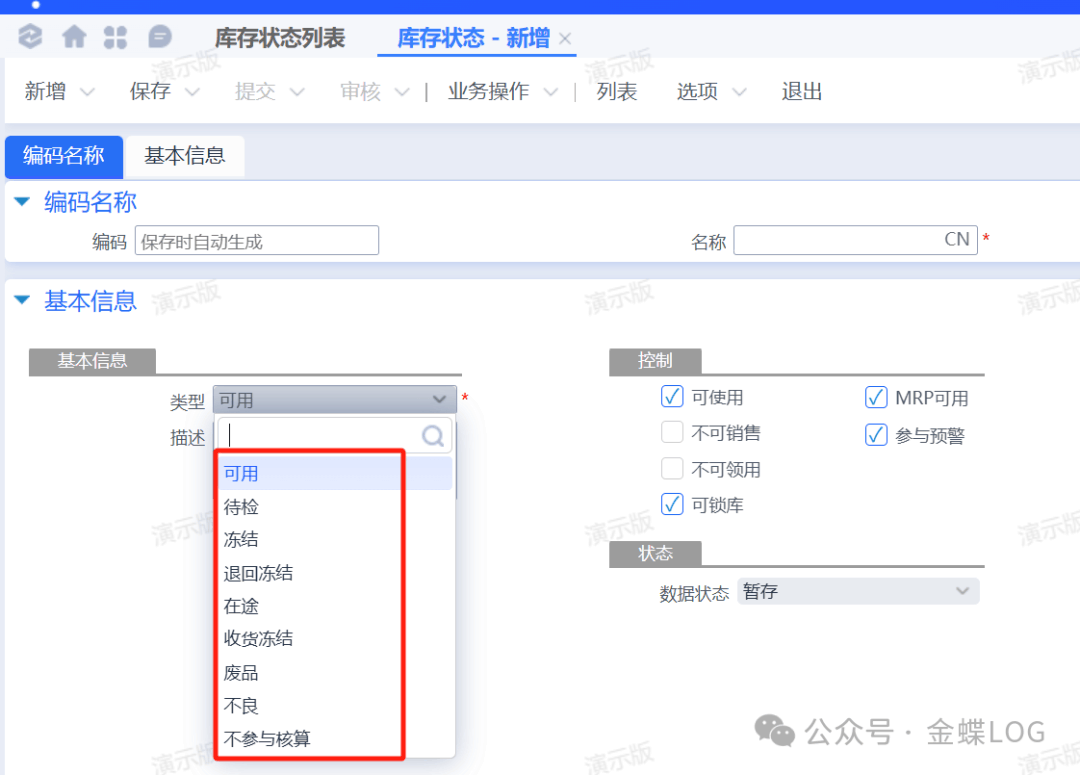库存状态的控制类型一共有6种:可使用、不可销售、不可领用、可锁库、MRP可用、参与预警
