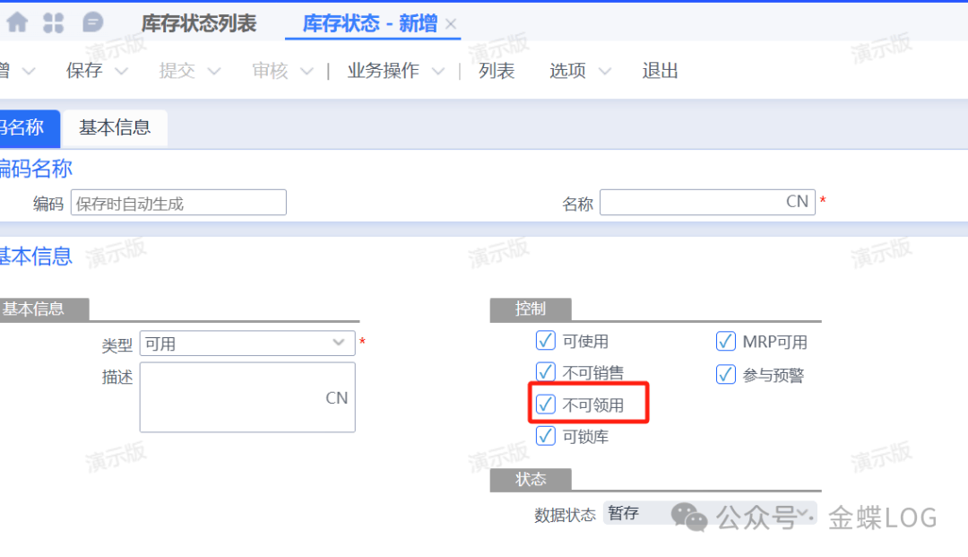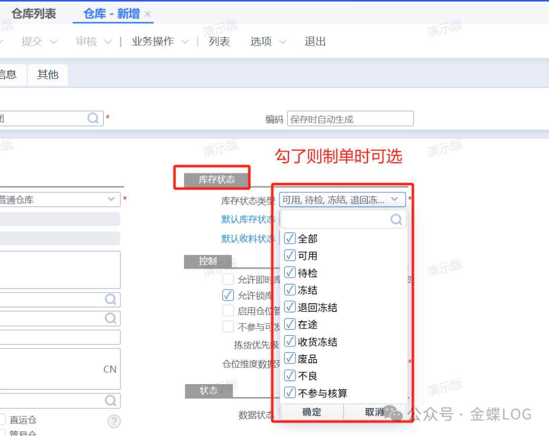 勾选了这个之后,这个库存状态可以被所有单据使用,当然前提没有勾【不可销售】、【不可领用】。