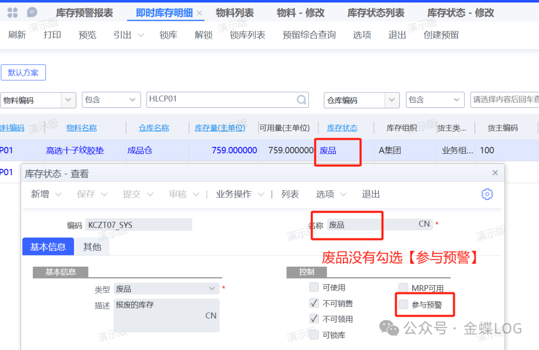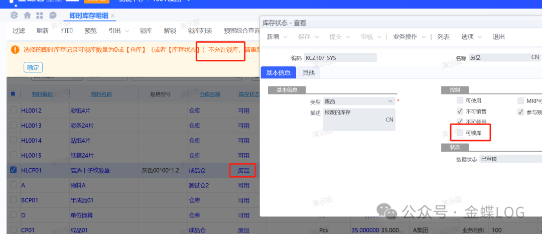 勾选了这个之后,【即时库存】锁库功能才能对这些库存状态进行锁库。比如像下图【废品】这个状态,没有勾选系统则不允许锁库。