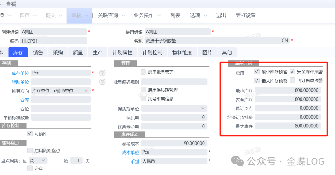 勾选了这个之后,物料上面设置了最小库存、安全库存、再订货点、最大库存预警值之后;