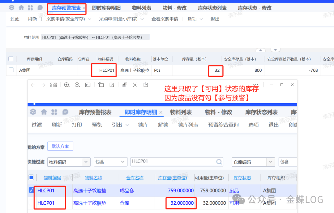从下图来看,【废品】没有勾选【参与预警】,所以上面的759数量没有统计到预警报表里。