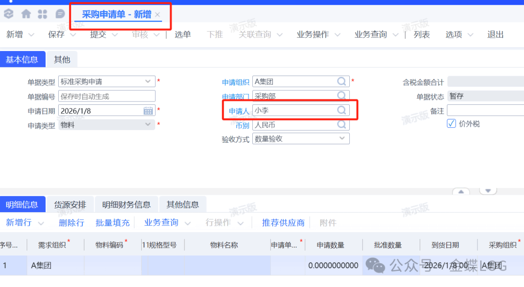公司入职了新员工小李,是采购部的一名采购员;平时在下采购申请的时候申请人需要选到自己;系统应该要如何添加小李这名员工相关信息?