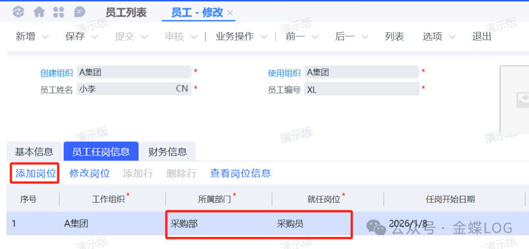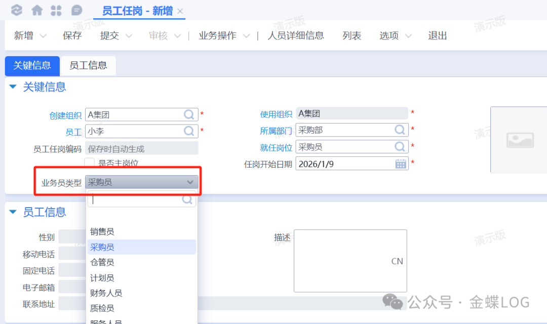 因为小李应聘的是采购部的采购员,现在员工信息建完了,还需要创建采购员这个岗位信息。在弹出的新增界面把岗位【名称】和【所属部门】维护一下,保存、提交、审核即可使用。其他字段有需要再维护。