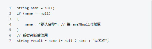 实战中最常见的场景之一:判断变量是否为null,不为null则使用,为null则赋值默认值。传统if判断繁琐,用空合并运算符能一行搞定。注意:?? 和 ??= 不会触发变量的getter/setter,比if判断更高效,且支持所有可空类型(包括值类型可空,如int?、DateTime?)。2. 类型转换:用 as 替代强制转换,避免异常
