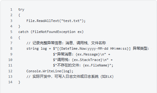 很多新手习惯用catch (Exception ex) 捕获所有异常,这样会吞掉一些严重异常(如OutOfMemoryException、StackOverflowException),导致问题难以定位。正确的做法是:只捕获具体的异常类型,对于未知异常,不捕获,让程序崩溃并记录日志,便于排查。2. 异常日志:记录完整异常信息,便于排查