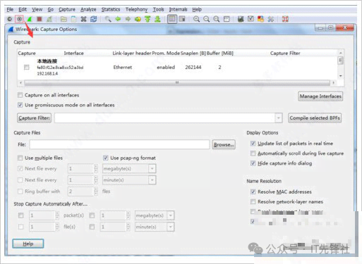 2、请进行点击操作以选择网络接口卡的捕获选项,请确定并选择您希望用于数据抓取的网络接口设备;如果无法确定具体是哪个网络接口,则可以看packes项数据变化最多接口,请先选择该对象,随后进行点击操作“start”开始抓包;