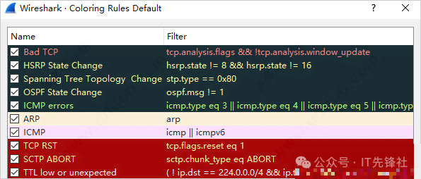 8、在数据包列表区域,不同的通信协议会以不同的颜色进行标识和区分。协议的颜色标识具体设置位置是在菜单栏中的视图选项下,再选择着色规则进行配置,如下所示。