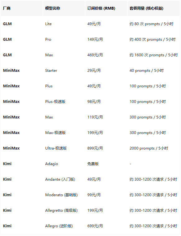 那正好了解下目前国内几家 Coding Plan 的内容,也方便大家对比。 本文仅涉及 GLM、Minimax、Kimi 3家自有产品的订阅套餐对比,像火山引擎、千问、无问芯穹类的综合套餐未加入对比。