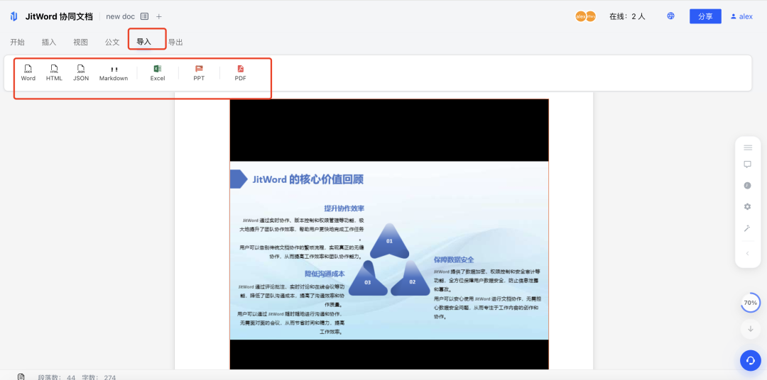 六、写在最后做协同文档产品,我们始终相信:好的功能不是"能做",而是"做得优雅"。 Office 预览这个需求,市面上99%的方案都是"能用就行",但我们愿意多花一周时间打磨嵌入体验、优化加载性能、打通文档体系。 因为办公效率的提升,往往就藏在这些"不起眼"的细节里。 如果大家也被Office文件预览困扰过,欢迎体验JitWord的新功能。 关于JitWord