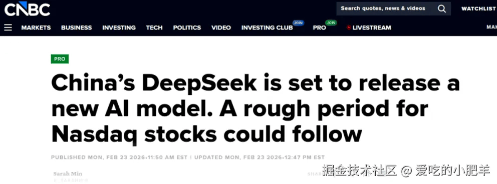 但这组数据已经有人出来打假了,说部分截图存在明显问题,数字本身不可靠。 所以这些就先存疑。等正式发布再说。 发布时间方面,路透社说最快下周,也有说 3 月前后的。 反正,应该是近在咫尺了。 然后就是 CNBC 那篇预警。 标题大概是:纳斯达克可能迎来"DeepSeek 第二时刻"。