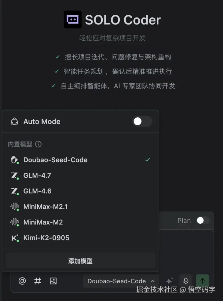 可能有些朋友还不太熟悉 SOLO 是什么。 简单说,它就是 TRAE 中国版里一个挺特别的模式,让你能在一个很干净的界面里,专心跟模型对话。 写代码、处理文本。有点像给你一个私人工作间,工具齐全,还特别安静。 以前要用上它,可能要排队等白名单,还得琢磨一下权限或者费用。但从现在开始,只要你的 TRAE中国版 IDE 更新到最新版本,点进去就能直接切换到 SOLO模式,免费使用。 内置模型包括:Doubao-Seed-Code、GLM-4.7、GLM-4.6、MiniMax-M2.1、MiniMax-M2、Kimi-K2-0905。