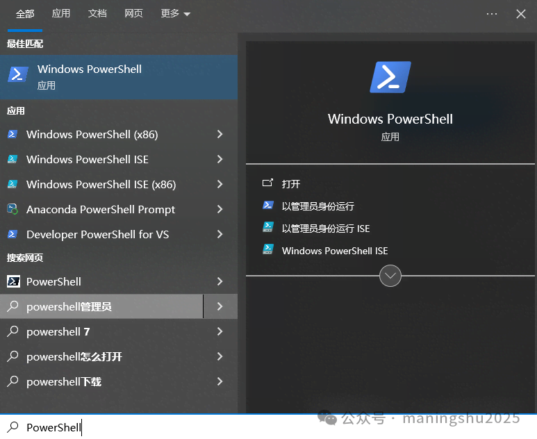 3.2 win+s,输入PowerShell,右键Windows PowerShell,以管理员身份运行。