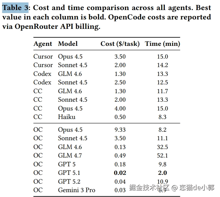 基于这些数据,论文认为当前 LLM Agent 尽管在单一代码生成上有突破,但在端到端工程上下文(包含设计、代码库理解、工程流程)仍远未达到企业生产标准。 另外,论文也有一个有趣的结论数据,主要统计了各 Agent + Model 的每任务成本(美元)和平均耗时(分钟),例如: