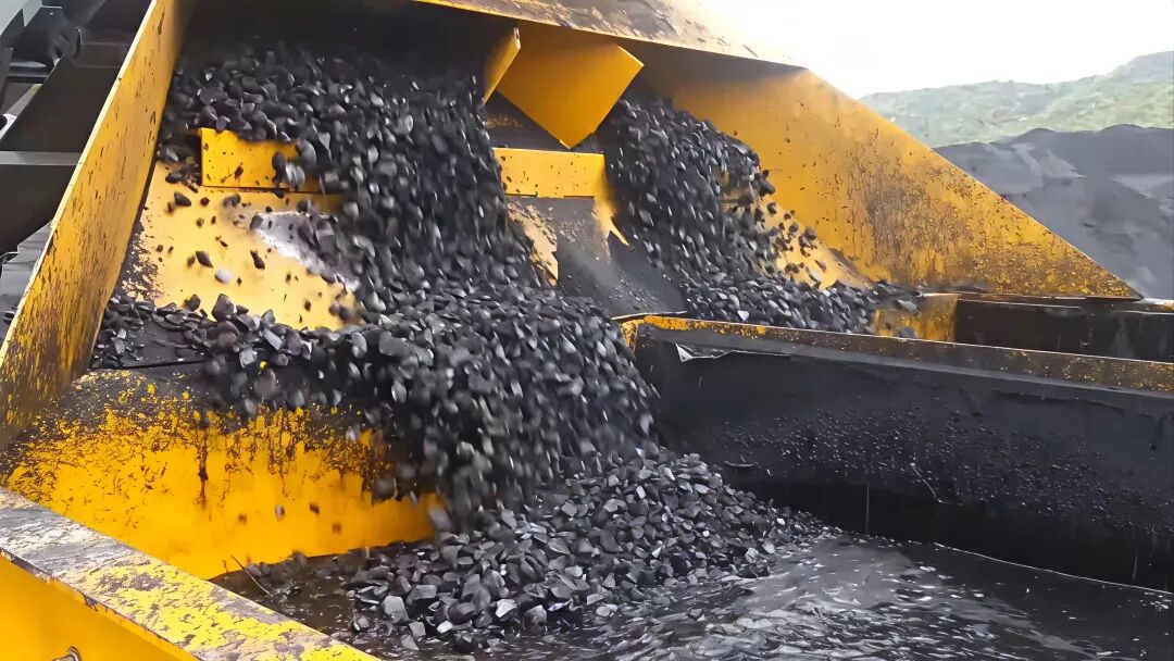 通过这一步,原煤里大半的无用矸石就能被彻底分离出去。