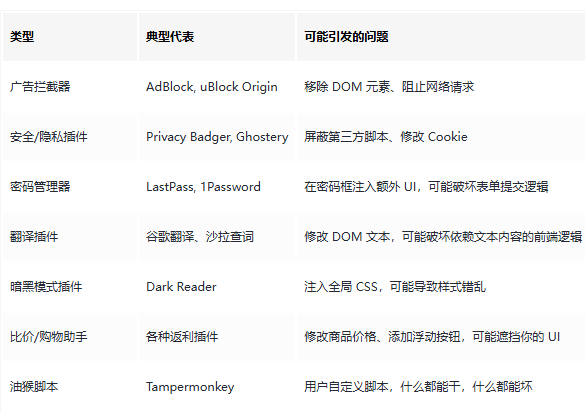 就在我准备把这个 issue 标记为“无法复现,关闭”的时候,产品经理幽幽地说了一句:“要不你试试装几个浏览器插件?”