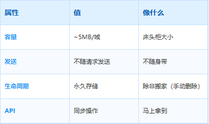 LocalStorage 是 HTML5 引入的存储方案。最大的特点:不会随请求发出去。