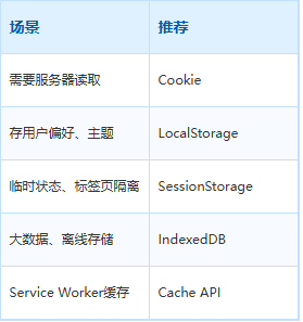 IndexedDB 是浏览器内置的数据库。容量巨大,能存文件、音频、视频这些大东西。