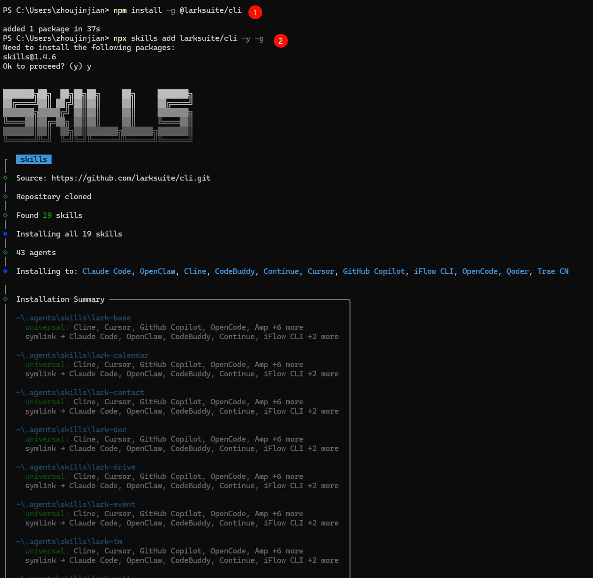 所以我才说,飞书这一步走得非常狠,也非常清醒。 传统产品都在拼 DAU、拼停留时长,必须打开 App 才算有效使用。 但飞书直接把自己开放成 CLI,让所有 Agent 都能通过命令行调用服务。 这意味着:用户不用打开飞书,也能深度使用飞书。 传统日活数据可能会降,但用户真正获得的效率与价值,反而大幅提升。 这也说明,团队从上到下都想得非常透彻: 一个真正的效率工具,就应该为用户的效率服务,而不是为了数据指标服务。 2. Cluade Code接入如何飞书CLI第一步:安装以下几种方式任选其一: 方式一:从 npm 安装(推荐):