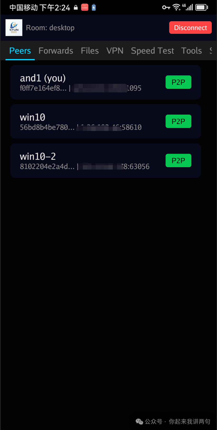 ▲ Peers 节点发现 Forwards 端口转发 把远端服务的端口映射到本地。支持同时转发多个端口,一键启停。