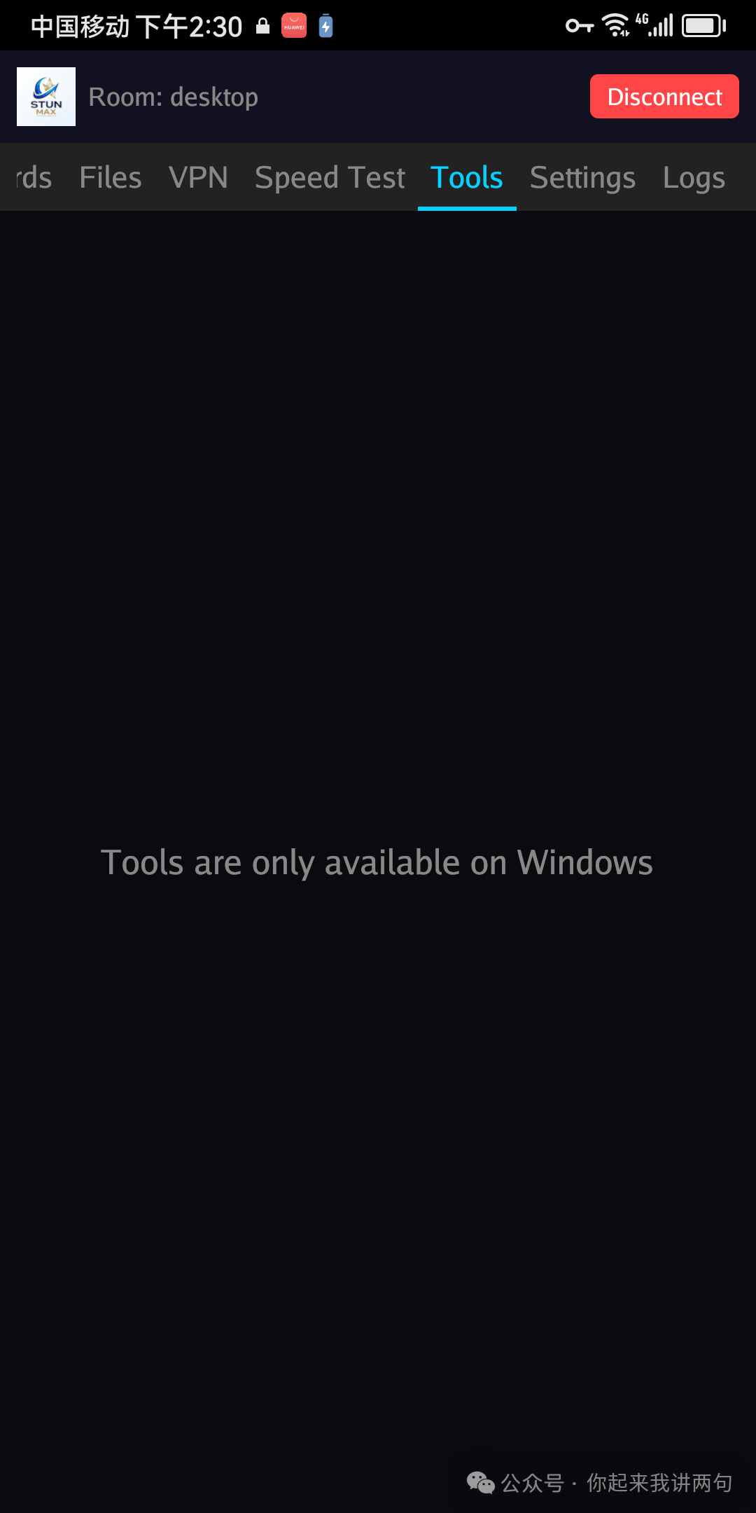 ▲ Tools 工具箱 Settings 设置 服务器地址、房间配置、加密参数、界面主题等全局设置。