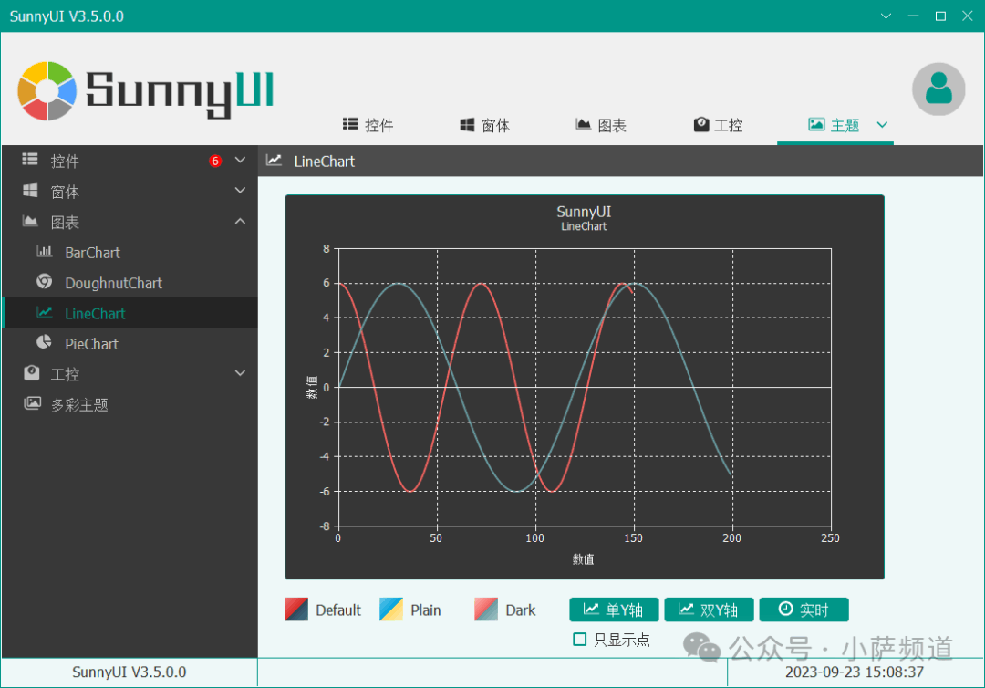 这些控件如果自己从头写,耗进去的时间不是一两天。 第二,17 套主题,一键切换。 SunnyUI 内置了 17 套主题风格,包括蓝色、绿色、红色、紫色等常见配色,以及一套从 Element UI 借鉴而来的设计语言(所以叫 SunnyUI)。用起来只需要一行代码: 对于需要换肤能力的桌面应用,这个功能是实打实的工程节省。 第三,多页面框架,7 套模板。 这是 SunnyUI 最被低估的功能。它内置了 7 种多页面应用框架模板,参考了 Element UI 的页面组织方式,主frame + aside 导航 + 内容区,配合 做企业管理软件、数据监控系统,这种"主界面 + 多页面"的架构是最常见的。用 SunnyUI 的框架模板,搭一个这样的系统比你想象中快很多。