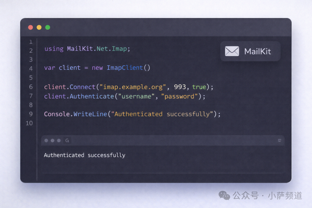 认证安全:覆盖所有主流方案现代邮件服务对认证的要求越来越严格。MailKit 支持的 SASL 机制包括:CRAM-MD5、DIGEST-MD5、LOGIN、NTLM、PLAIN、SCRAM-SHA-1(带 -PLUS 变体)、SCRAM-SHA-256(带 -PLUS)、SCRAM-SHA-512(带 -PLUS)、OAUTHBEARER、XOAUTH2。 Gmail、Microsoft 365、Exchange Online,这些用 OAuth2 的主流服务,MailKit 都有原生支持,不需要你另外找方案拼接。 加密签名:DKIM / S/MIME / OpenPGP 全覆盖邮件安全越来越重要。MailKit 支持 DKIM 域名密钥签名验证(邮件发送方身份验证)、S/MIME(企业级证书签名加密)、OpenPGP(端到端加密,私密性要求高的场景首选)。这三个方向互相补充,覆盖了从发送到接收的完整安全链路。 代理支持:藏在细节里的体贴很多库做到协议支持就停止了,代理这块几乎是空白。MailKit 完整支持 SOCKS4/4a、SOCKS5、HTTP/HTTPS 代理。对于需要在受控网络环境下调用邮件服务的场景,这直接决定了你能不能跑通。 跨平台:Windows、Linux、macOS 通吃目标框架覆盖 .NET Framework 4.6.2 及以上、.NET Standard 2.0/2.1、.NET 6、.NET 8、.NET 10。不管你的项目是古老的企业级 .NET Framework 遗产,还是最新的 .NET 8 云原生服务,MailKit 都能无缝接入。AOT 兼容性也做了认真对待,移动端和 Blazor WASM 场景不用担心。 写起来是什么体验看一个最简单的发送邮件的例子,感受一下 API 设计: 干净、直白、不绕弯子。async/await 完整支持,CancellationToken 随便传,协议日志随时开,错误信息明确到你知道是哪一行出了问题而不是对着 "TimeoutException" 发呆。 IMAP 读取邮件同样简洁: 这套 API 设计背后是对协议细节的充分理解。开发者不需要知道 IMAP 的 literal string 怎么处理、不需要知道 untagged response 可能有副作用——这些坑 Jeffrey 都替你踩过了。