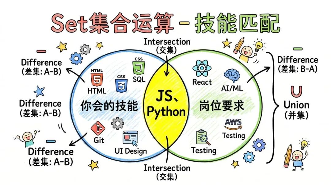 2. Set 家族新方法:集合运算这组方法解决了一个很实际的问题,那就是两个集合之间该怎么比较: 以前要写一堆循环才能算出来的东西,现在一行代码搞定。