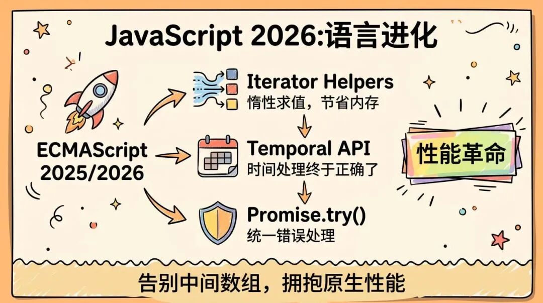 如果有人问你 JS,大部分人可能还停留在 async/await、Promise、ES6 那个年代。 但 JavaScript 一年一个版本,语言早就不是原来的样子了。 还有框架、运行时、构建工具……整个生态都在快速演进。 本篇带你看看 2026 年的 JavaScript 和生态到底是什么样的。 1. 语言新特性这里重点说几个真正能改变你写代码方式的新特性。 1.1 Iterator Helpers:链式操作不再创建中间数组❌ 旧方式:每一步都创建新数组 ✅ 新方式:惰性求值,算到第 3 个就停 使用迭代器助手,大数据量下内存占用大幅降低,而且不只数组能用,Set、Map、生成器都可以。