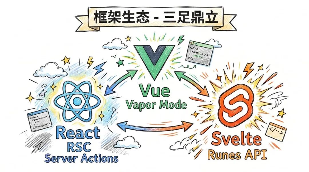 但也要提醒:这些技术去年经历了两次严重的安全漏洞事件,如果你在用 RSC,务必关注官方安全公告。 2.2. Vue 生态系统Vue 3.5 稳定运行,3.6 已经在 Alpha 阶段,最大的看点是 Vapor Mode,作为一种全新的编译策略,据说性能可以和 Solid、Svelte 5 比肩。 另外,Vite 的亲爸爸 VoidZero 收购了 NuxtLabs,Nuxt 4.0 也已经发布。 Vue 生态正在往更统一、更完善的方向走。 2.3. Svelte 生态系统Svelte 5 带来了全新的 Runes API,实现了更细粒度的响应式,实际效果就是更高效、更快。 有意思的是,Svelte/SvelteKit 也是 Vercel 旗下的产品。
