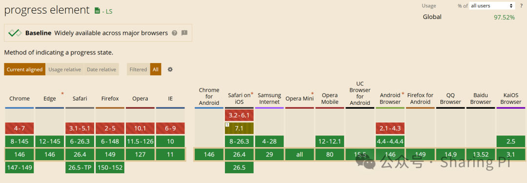 建议访问 Can I Use 网站,以及时了解 progress 属性在各类浏览器中的最新兼容性支持情况。下图数据截至 2026.04.04。