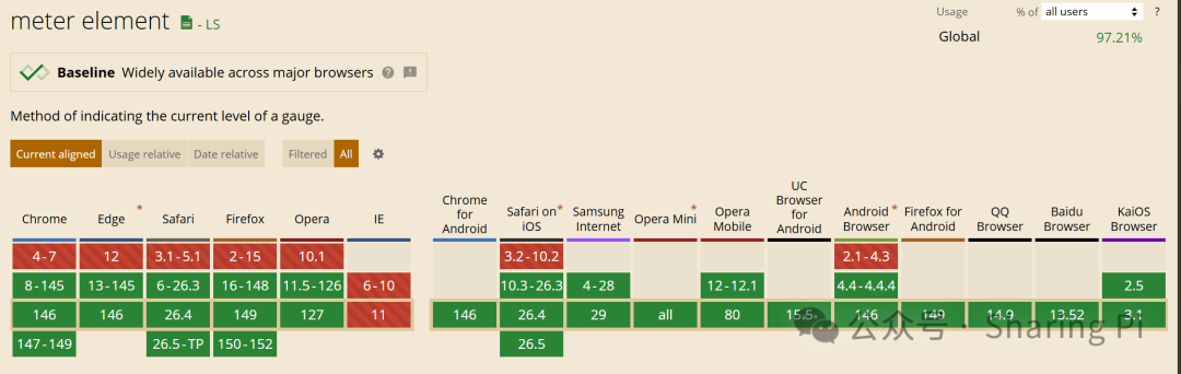建议访问 Can I Use 网站,以及时了解 meter 元素在各类浏览器中的最新兼容性支持情况。下图数据截止 2026.04.08。