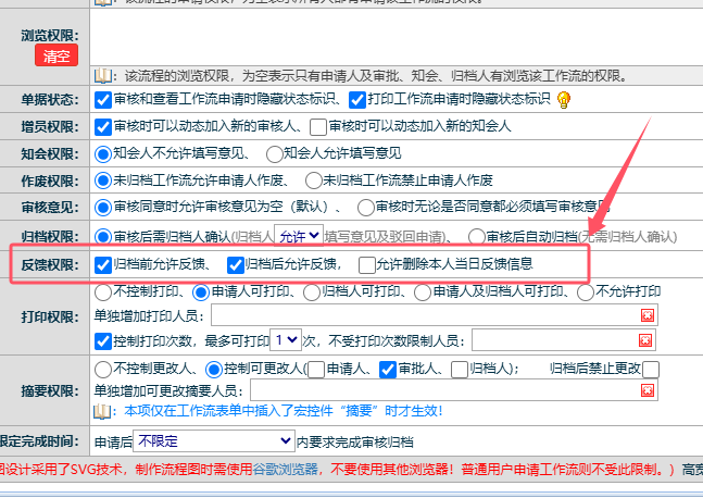 以管理员身份登录点晴MIS系统,进入工作流模块-》流程管理,找到需要设置的流程,点击编辑:在流程设计的“反馈权限”中,勾选“归档后允许反馈”即可。