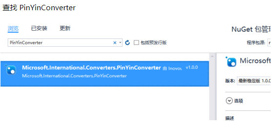 1.首先在NuGet安装pingyinConverter