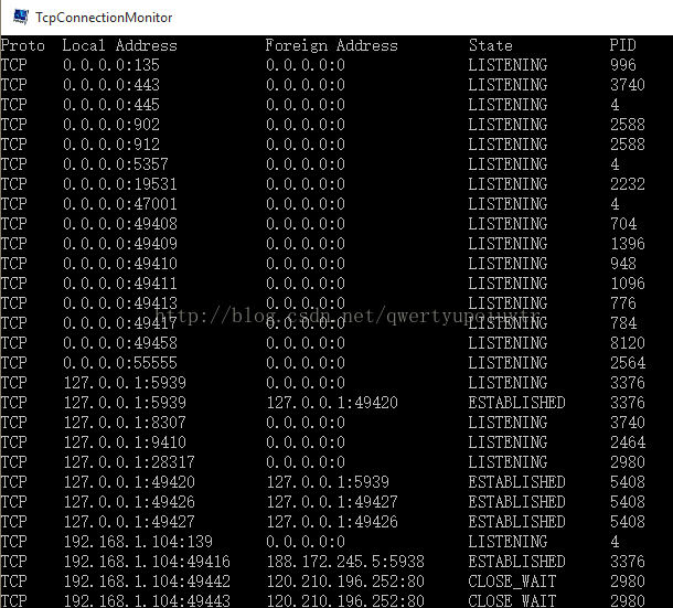 TcpConnectionTableHelper.MIB_TCPROW_OWNER_PID[] tcpProgressInfoTable = TcpConnectionTableHelper.GetAllTcpConnections();